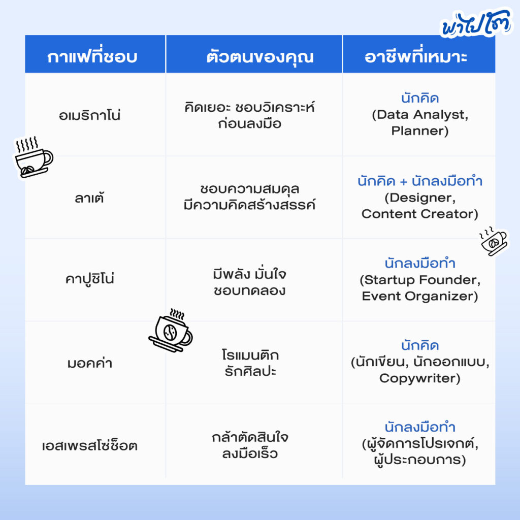 ถ้าอยากรู้ว่าตัวเองเหมาะกับอาชีพไหน ลองสังเกตตัวเองจาก “กาแฟที่ชอบ” เพื่อ ทายนิสัย การทำงานดูก็ได้นะ อิอิ